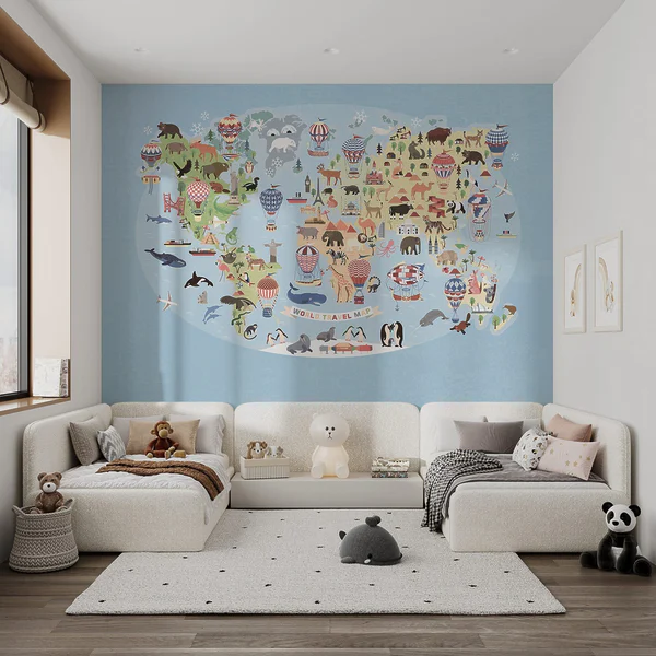 Wall murals Wall murals Map of the world with cartoon animals (SKU: w08171) /sqft