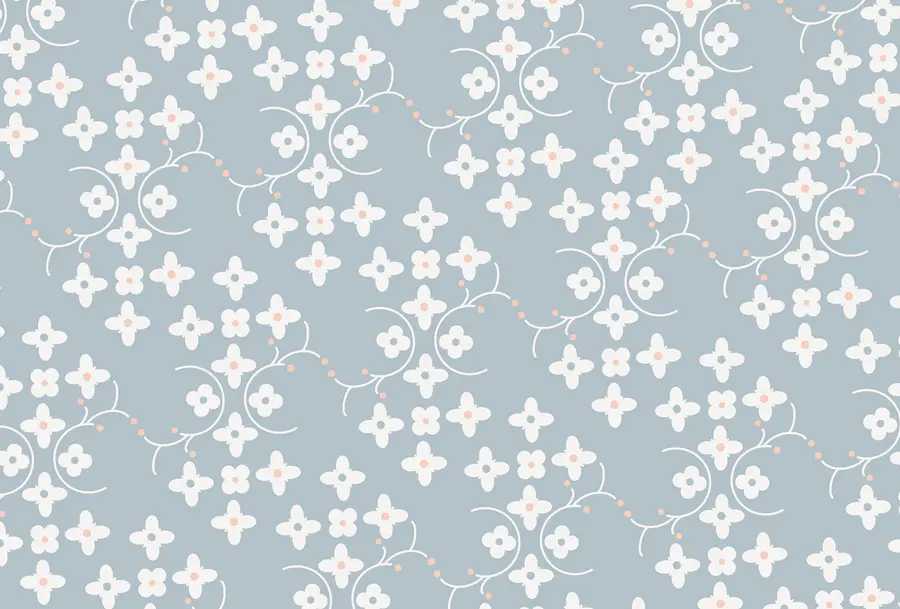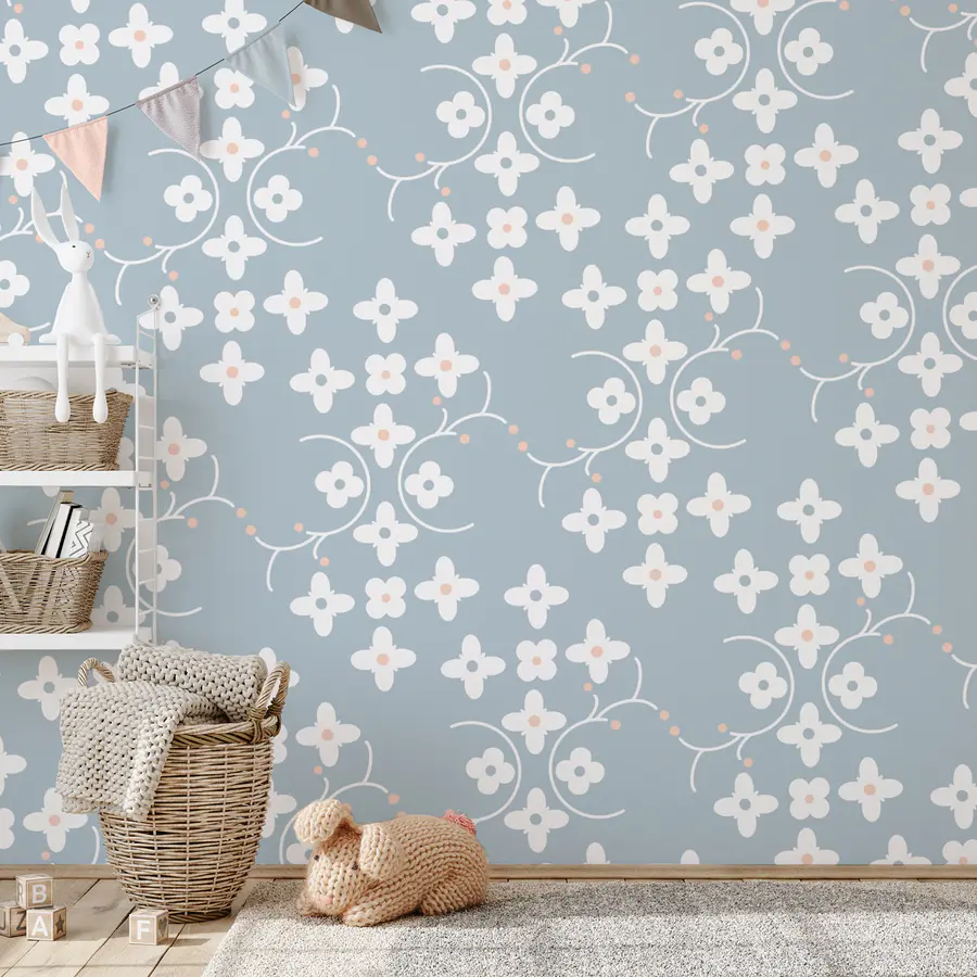 Wall murals Pattern of white flowers and pink dots on a blue background