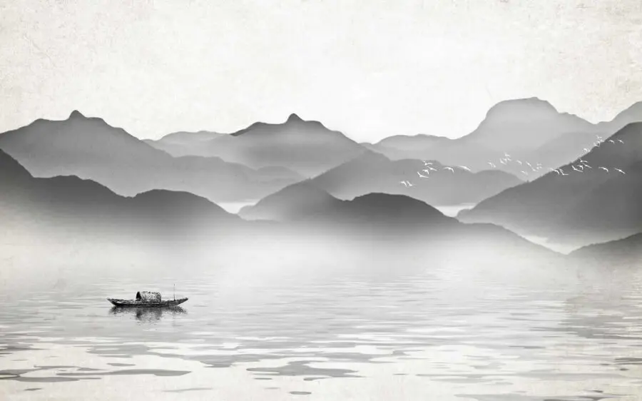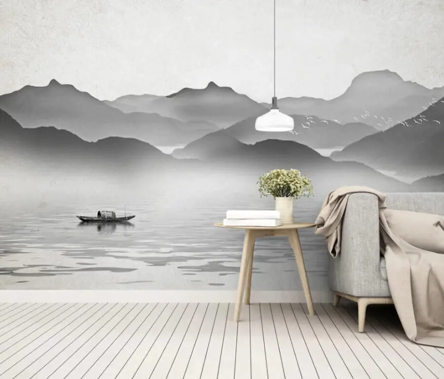 Wall murals Boat on water with mountains in the background