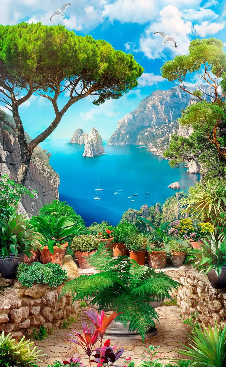 Transform any room into a mini-vacation with this stunning mural, "View of the Ocean from a Cliff." Imagine waking up to that breathtaking ocean view every day—no sunscreen required! The vibrant blues of the water paired with lush greenery invite a sense of calm. Picture a cozy corner where you sip your morning coffee, feeling like you’re lounging on a sunlit terrace. It’s as if the sea breeze flows right through your walls. Plus, it’s a great conversation starter. Friends will definitely want to know if you’ve secretly moved to a coastal paradise. Perfect for nature lovers and daydreamers alike!