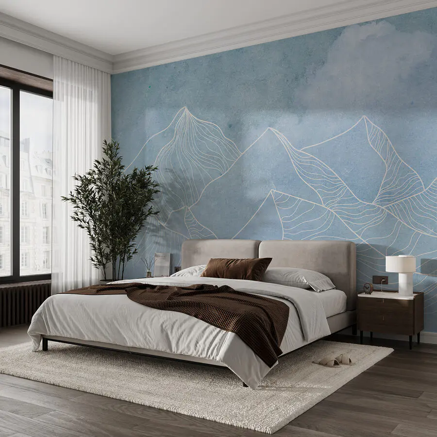 Wall murals A drawing of mountains with clouds