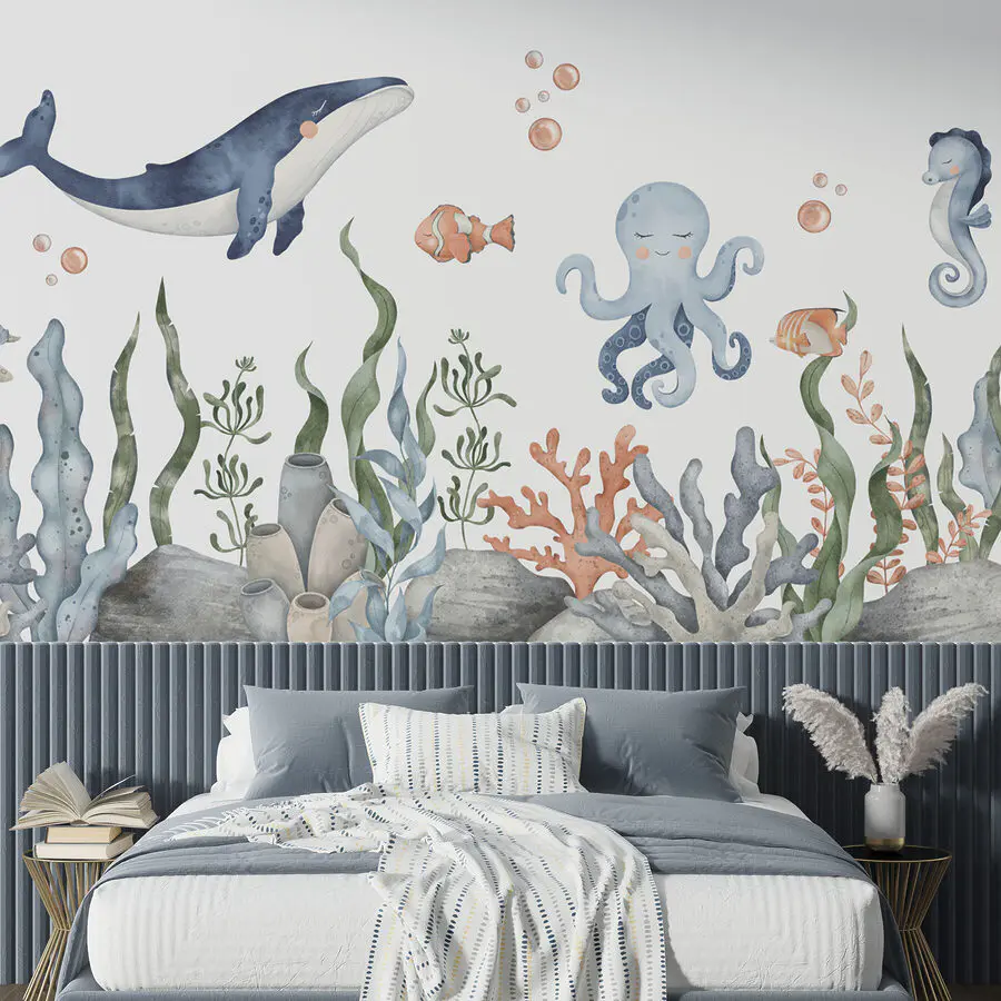 Transform any room into an underwater wonderland with this delightful mural featuring a whale, an octopus, and their aquatic friends. Imagine a soothing escape where vibrant sea life dances through a colorful reef. Perfect for a child's room or a cozy play area, it sparks joy and imagination. Picture the little ones beaming as they explore this oceanic adventure right on their walls! The gentle colors create a calm vibe, sure to inspire dreams of mermaids and treasure hunts beneath the waves. Just hang it up and let the magic flow!