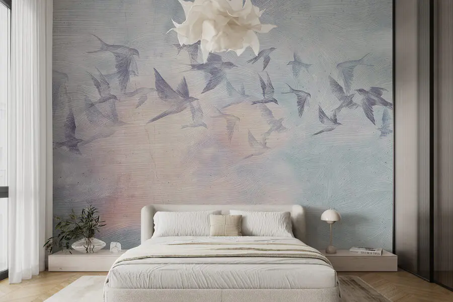 Imagine watching a flock of birds swooping through the sky—how serene and captivating, right? This wall mural, aptly named "A Flock of Birds Flying in the Sky," brings that same sense of freedom and movement into your space. It’s like a gentle watercolor dream come to life. Think a peaceful morning walk, but on your wall. Perfect for anyone who loves nature with a splash of artistic flair. A conversation starter for sure, it transforms any room into a little escape. Who knew walls could feel so free-spirited?