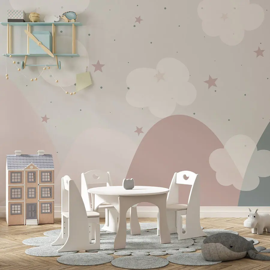Transform any room into a dreamy escape with this whimsical mural, "Landscape with Clouds and Stars." Imagine wandering through a soft, pastel world where mountains gently rise against a starry sky, inviting daydreams and stargazing. It’s like bringing a piece of serene nature indoors, perfect for a kid's room or a cozy nook. Picture curling up with a good book, surrounded by these calming colors—soft pinks and cool blues—while the clouds wink playfully. Add this mural, and let every glance transport you to a place where imagination runs wild and starlit adventures await!