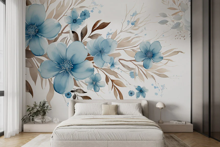 Wall murals Painting of blue flowers and brown leaves