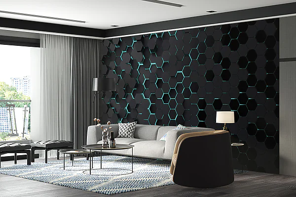 Wall murals Wall murals Black hexagons with blue lights (SKU: u93618) /sqft